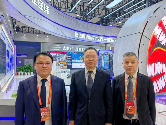 中国铁建党委书记、董事长汪建平,中铁十四局党委副书记、董事、总经理周长进,铁建重工党委副书记、董事、工会主席贺勇军在中国铁建大盾构展台合影