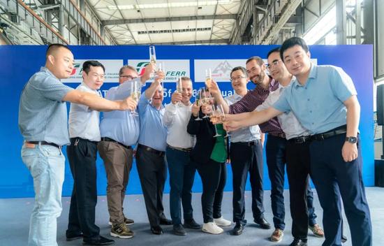 7月19日,意大利客户高举右手用力将香槟酒瓶砸向盾体(掷瓶礼),在四溅的香槟酒花和众人欢呼声中,由中铁装备研制的土压敞开双模盾构机“中铁1282号”在郑州正式下线,该设备将助力意大利福尔泰扎铁路隧道项目建设。意大利客户代表Tafuri Laura、Lazzarino Maurizio及集团公司党委委员、总工程师贾连辉等出席下线仪式。