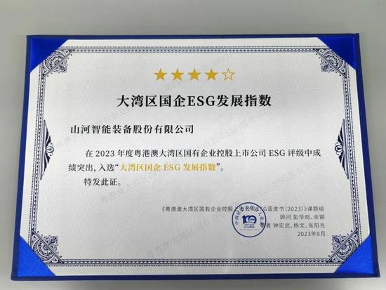 论坛发布了《粤港澳大湾区国有企业社会价值蓝皮书暨控股上市公司ESG蓝皮书<2023>》,峰会首次发布“中国ESG上市公司大湾区先锋50”,并对“大湾区国企ESG发展指数”入选企业进行了表彰,以榜样的力量引导中国企业提升ESG建设水平。凭借在ESG领域的优秀表现,山河智能装备股份有限公司成功入选“大湾区国企ESG发展指数”榜单(第六位),并且凭借《聚焦数智化转型,打造高端装备制造业创新发展新样本》案例成功入选《粤港澳大湾区国有企业控股上市公司ESG蓝皮书<2023>》。