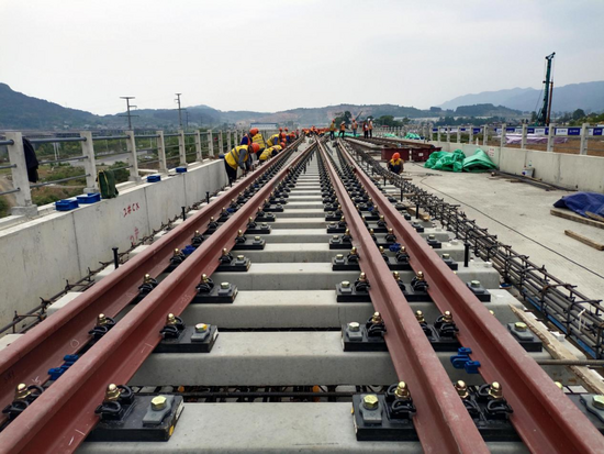 贵南高铁是广西境内第一条设计时速为350公里的客运专线,全线使用铁路道岔共计199组,铁建重工道岔分公司供应147组,全线道岔占比74%;其中正线道岔采用时速350公里60kg/m钢轨18号无砟单开道岔共计105组,铁建重工道岔分公司供应99组,正线道岔占比94%。