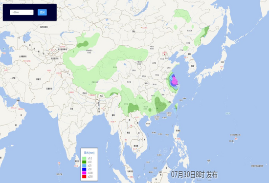 7月30日8时至31日8时,江苏中南部、上海、浙江中北部、安徽东部、广东中南部、广西中部、云南中南部、台湾岛以及黑龙江东部、辽宁东北部等地部分地区有大到暴雨,其中,江苏东南部、上海中北部、浙江北部、台湾岛南部等地部分地区有大暴雨,局地特大暴雨(250~320毫米)。内蒙古东北部和西部、新疆南疆盆地、甘肃河西等地部分地区有4~6级风,江苏东南部、浙江东北部、上海等地将有5~7级、阵风8~9级的大风。