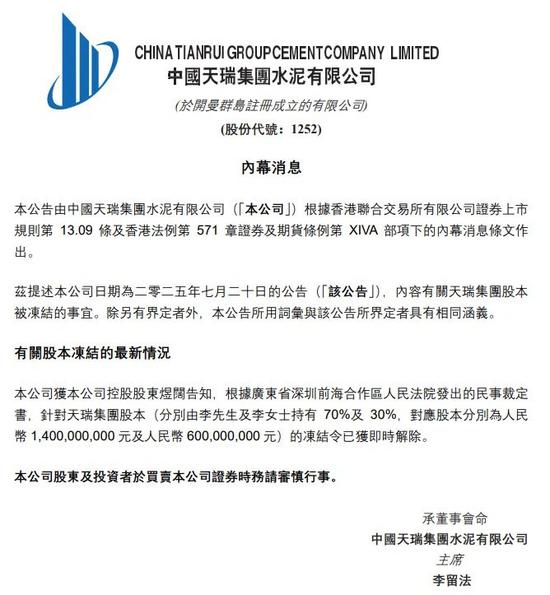 7月29日,天瑞水泥发布公告,公司获公司控股股东煜阔告知,根据广东省深圳前海合作区人民法院发出的民事裁定书,针对天瑞集团股本(分别由李先生及李女士持有70%及30%,对应股本分别为人民币14亿元及人民币6亿元)的冻结令已获即时解除。