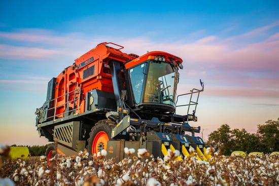 如今,铁建重工的采棉机采净率超94%,含杂率低于10%,一台六行采棉机一天能收500亩棉田,抵得上1200人手工采摘。