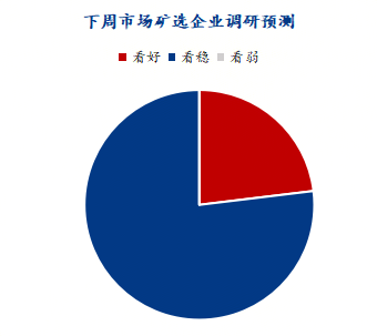 Mysteel针对下周市场走势情况,对部分钢厂、矿山、选厂进行了调研,其中,其中有钢企客户中有20.00%认为国产矿价格有上涨空间,80.00%客户认为下周市场稳,暂无客户认为下周市场有下降空间。23.08%矿选企业客户认为国产矿价格上涨,76.92%客户认为价格稳,暂无客户认为价格有下跌风险。具体情况如下图所示。