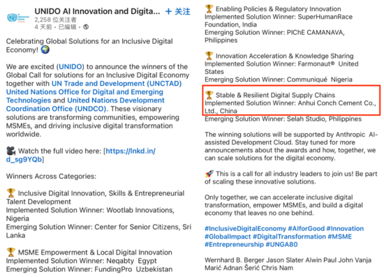 从安徽芜湖到联合国舞台,海螺再次让世界看见中国建材工业的智造力量。继4月23日海螺集团携手华为发 布全球首个“AI+水泥建材大模型”后,此次“海螺云工大模型”在全球700个方案中脱颖而出,斩获“2025包容性数字经济最佳实施方案奖”,不仅是对海螺数智化创新实践的高度肯定,更标志着中国建材行业首次在这一顶级国际评选中“破圈”。稳定、韧性、绿色——海螺携手华为这一战略合作伙伴,用工业大数据和人工智能筑起产业链“安全墙”,为全球传统制造业重塑贡献“中国方案”。