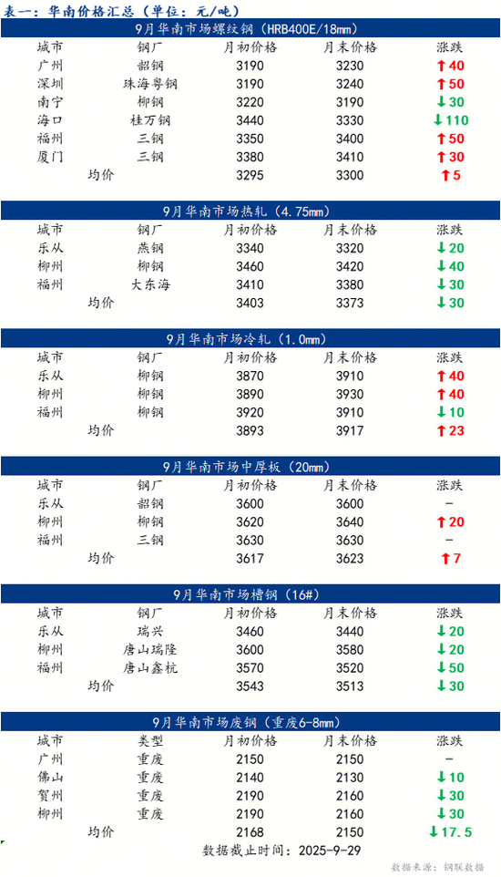 表1 9月华南各品种价格涨跌一览表 (单位:元/吨)