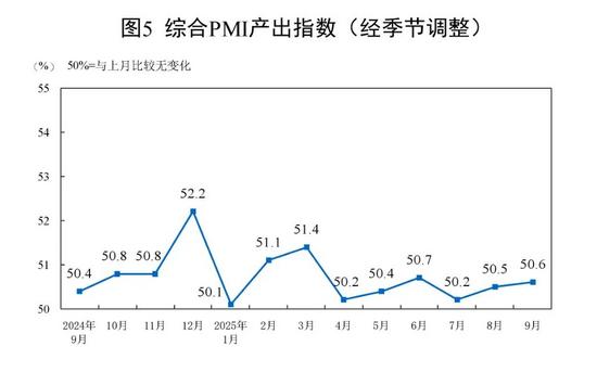 9月份,综合PMI产出指数为50.6%,比上月上升0.1个百分点,持续高于临界点,表明我国企业生产经营活动总体扩张继续加快。