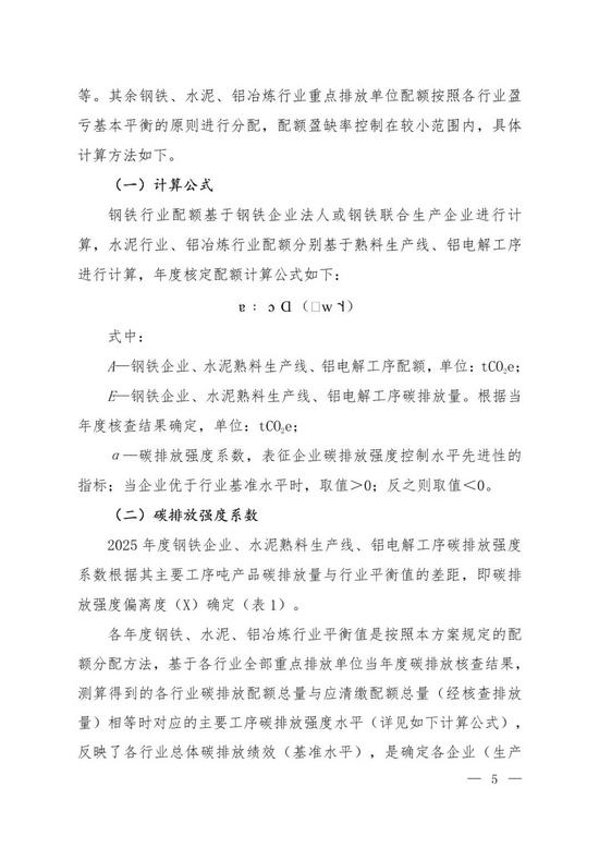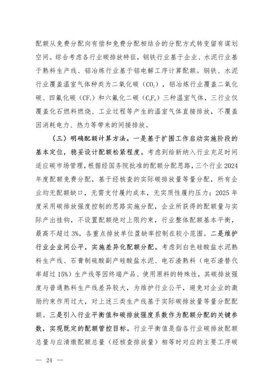 征求意见稿明确了配额分配范围,本方案适用于纳入全国碳排放权交易市场钢铁、水泥、铝冶炼行业2024、2025年度重点排放单位名录的企业(生产线、工序)配额分配,配额核定前关停以及2024、2025年新投产的企业(生产线、工序)不纳入当年度配额分配范围。其中,水泥行业覆盖温室气体种类为二氧化碳(CO2)。钢铁、水泥、铝冶炼行业覆盖化石燃料燃烧、工业过程等产生的温室气体直接排放不覆盖因消耗电力、热力等带来的间接排放