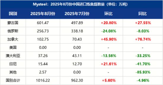 据中国海关总署数据,8月我国总进口量达1016.2万吨,环比上涨6%,同比下降5%。分国别看,蒙古国继续占据主导地位,进口量达601.47万吨,环比增长20.80%,同比增长27.55%,进口活跃度上升,8月份进口蒙古国炼焦煤市场价格震荡运行,绝对价格呈上涨趋势,受国内钢厂铁水产量高位支撑,以及前期低基数通关,通关效率提升明显。