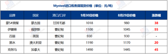 9月进口炼焦煤价格同样先抑后扬。前半月预期减退,盘面下跌导致现货价格小幅回落。后半月随着内蒙地区查超产再度发酵,盘面再度拉涨,贸易商开始挺价。随着节前下游钢厂采购需求旺盛,为假期提前进行补库,现货端供应偏向紧张,价格小幅提升。
