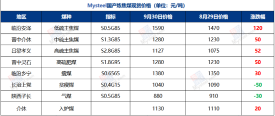 回顾9月份的炼焦煤市场,8月下旬开始随着宏观情绪消退;河北、山东、河南等下游焦钢企业在8月末9月初环保限产。虽然焦煤矿山在9月初也有短暂停产减产,但需求下滑叠加预期走弱导致炼焦煤持续阴跌,各煤种价格累计下跌60-100元/吨。进入下旬,焦钢企业纷纷开始节前补库,叠加9月3号之后铁水产量快速恢复至240万吨以上,需求在后半月集中兑现,使得煤价快速反弹,部分煤价已经涨至年内高点,目前安泽低硫主焦煤价格已涨至1590元/吨。