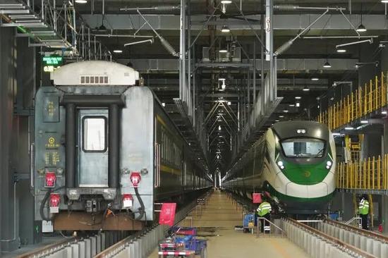 10月1日1时,客车检修员曾建华和罗宏伟正在检修库的列车底部进行检修作业。他们是去年入职的新生力量,两人所在的广州库检车间下部二班肩负着车辆走行部的安全重任。“我们的工作就像给列车做足疗,让它们健步如飞。”罗宏伟这样形容。