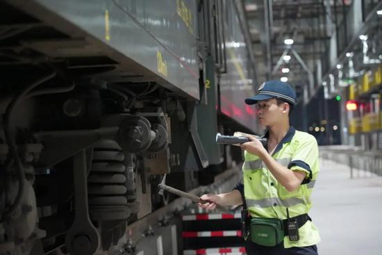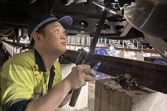 这对“底盘医生”搭档,凭借手中的检车锤,便可通过听声、目测,判断车辆走行部是否存在故障,及时消除隐患。他们用手电筒仔细查看轮对、轴箱、弹簧、固定螺栓等重点部位部件,确保每一处部件状态完好。曾建华说:“守护列车走行部安全的意义重大,我们不能有半点马虎。”
