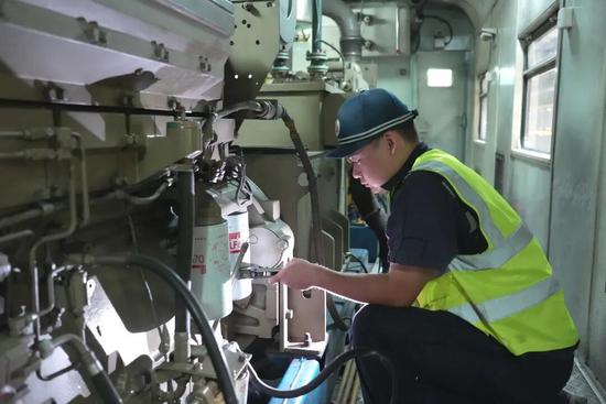 发电车被称为列车“动力心脏”,承担着全列空调、照明等设备的供电任务。在这个闷热的发电车检修间内,颜晟屹和同事们要在2小时内完成3台柴油发电机组的检修和保养。国庆中秋假期高峰时期,他们班组一个晚上需要完成8至9组发电车机组的检修任务。