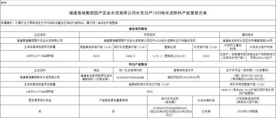 根据福建春驰集团国产实业水泥有限公司和福建春驰集团新丰水泥有限公司申请,经属地县、市工信部门逐级审核,现按照《水泥玻璃行业产能置换实施办法(2024年本)》规定和水泥产能管理相关政策要求,对福建春驰集团国产实业水泥有限公司补充日产1233吨水泥熟料产能置换方案予以公示。公示期为10个工作日,如有异议,请于公示期内以书面形式实名向我厅反馈。