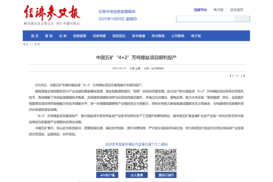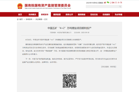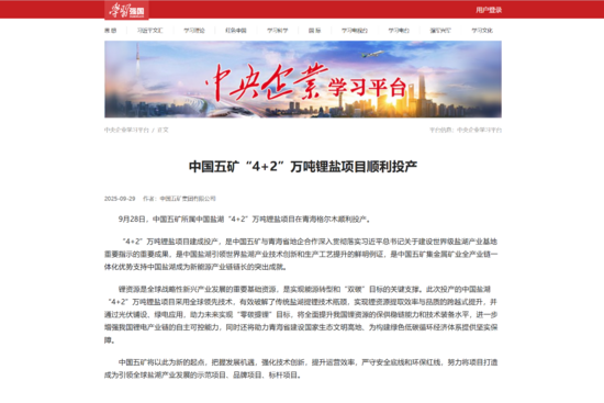 近日,中国五矿“4+2”万吨锂盐项目在青海格尔木顺利投产,人民网、新华网、国务院国资委网站、学习强国、经济参考报、中国能源报等主流媒体纷纷就此展开报道。