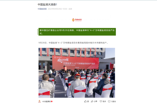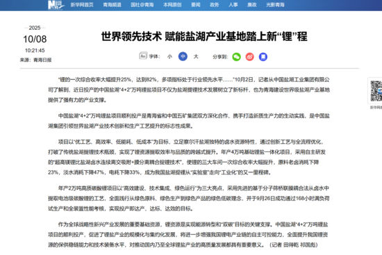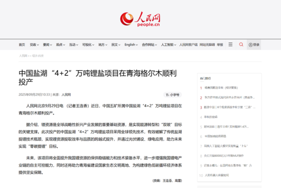 报道指出,作为全球战略性新兴产业发展的重要基础资源,锂资源是实现能源转型和“双碳”目标的关键支撑。此次投产的“4+2”万吨锂盐项目采用全球领先技术,有效破解了传统盐湖提锂技术瓶颈,实现锂资源提取效率与品质的跨越式提升,并通过光伏铺设、绿电应用,助力未来实现“零碳提锂”目标,将全面提升我国锂资源的保供稳链能力和技术装备水平,进一步增强我国锂电产业链的自主可控能力,同时还将助力青海省建设国家生态文明高地、为构建绿色低碳循环经济体系提供坚实保障。
