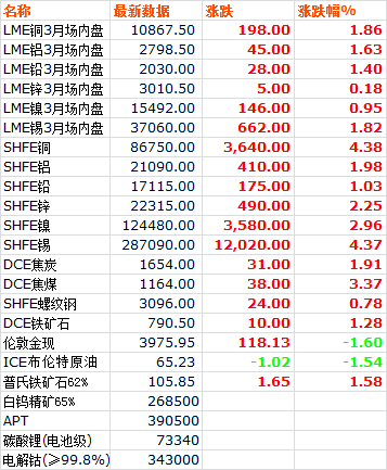 10日,LME六种基本金属价格全线上涨。三月期铜价收于10867.5美元吨,上涨1.86%。三月期铝价收于2798.5美元吨,上涨1.63%。三月期铅价收于2030美元吨,上涨1.40%。三月期锌价收于3010.5美元吨,上涨0.18%。三月期锡价收于37060美元吨,上涨1.82%。三月期镍价收于15492美元吨,上涨0.95%