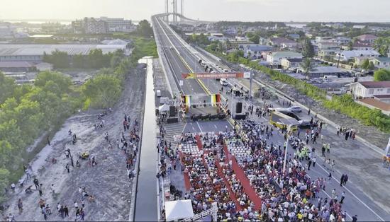 当地时间10月5日,由中国铁建国际集团有限公司承建的圭亚那巴拉特·贾格迪奥-德梅拉拉河大桥正式通车,圭亚那总统阿里、总理菲利普斯、副总统贾格迪奥,中国驻圭亚那大使杨扬等两国政要及社会各界代表上万人参加了通车仪式。