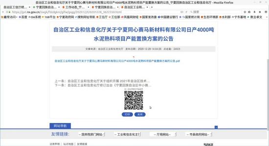 依据相关政策要求,自治区工业和信息化厅于 2020 年 12月28 日发布了宁夏建材集团股份有限公司申请的《宁夏同心赛马新材料有限公司日产4000 吨水泥熟料项目产能置换方案》的公告。