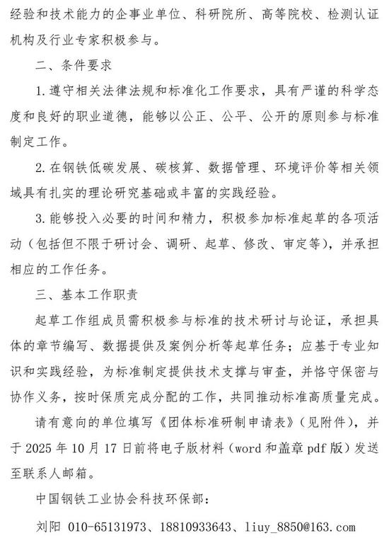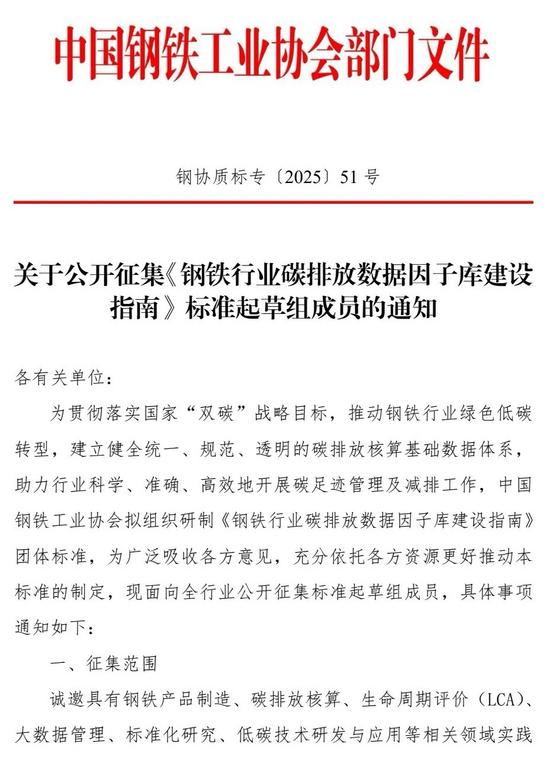关于公开征集《钢铁行业碳排放数据因子库建设指南》标准起草组成员的通知