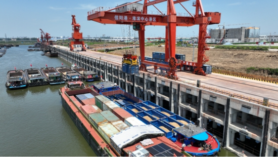 信阳港淮滨中心港区正在进行集装箱装卸作业