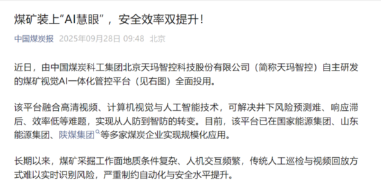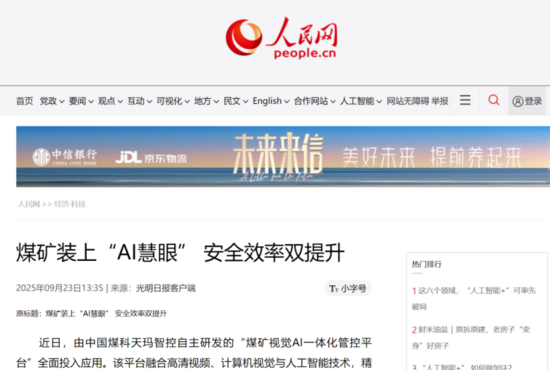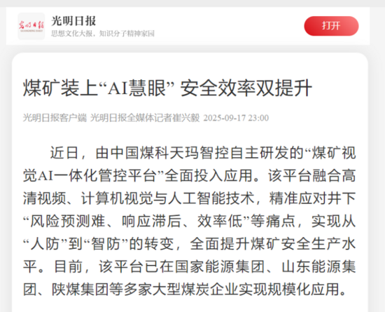 近日,光明日报、人民网、中国网、中国煤炭报等主流媒体以《煤矿装上“AI慧眼”,安全效率双提升》为题,对中国煤科天玛智控自主研发的煤矿视觉AI一体化管控平台进行报道。以下是媒体报道的内容。