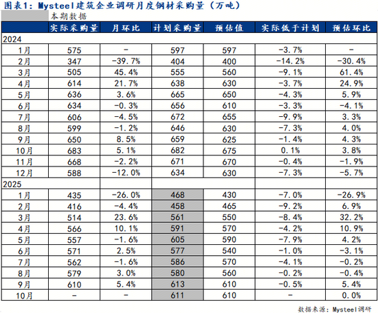 Mysteel建筑企业调研数据显示,2025年9月实际钢材采购量610万吨,较预计采购量减少0.5%,实际采购量月环比增加5.4%;10月份企业计划钢材采购量611万吨,根据9月份实际采购量、商家计划采购量以及当前市场表现来预估,10月份实际采购量月环比或将持平。