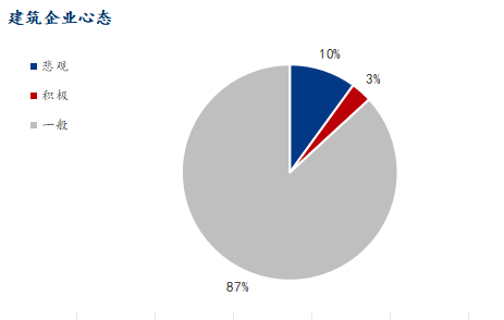 定性指标反馈:建筑企业原料库存水平中“低库存”比例较上期微涨;补库意愿“低”的比例均有所上升;此外,建筑企业心态“悲观”的比例也再次上升(具体表现见下图)。这也反映了市场对未来仍有很强的不确定性,当前企业普遍较为谨慎,依旧倾向于保持低库存的状态,多根据项目需求进行采购。
