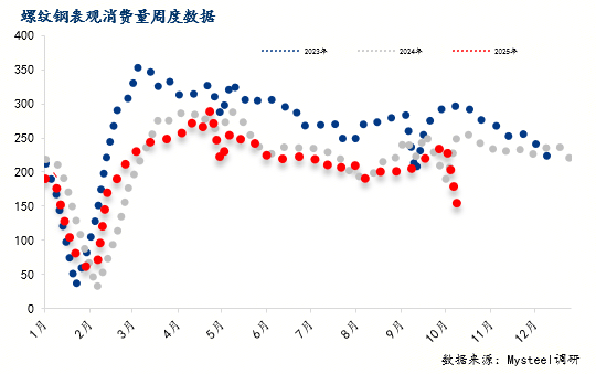 回顾Mysteel建筑钢材全样本口径数据,2024年9月,螺纹钢市场的表观消费量周均值在236.6万吨,全月最高值在255.46万吨。2025年9月份,周均值207.7万吨左右,表观消费量周度最高在220.44万吨,周均较去年同期低12.2%,同比降幅较前期进一步扩大。9月份市场市场整体需求表现尚可,在季节性因素影响及部分工地停工的背景下,终端需求仍有5%的增长,显示出市场需求的基础韧性。