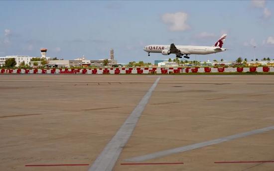 ▲ 10月4日,一架卡塔尔航空公司的飞机抵达马尔代夫维拉纳国际机场。新华社记者 伍岳 摄