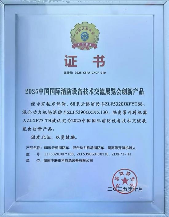 展会首日开幕式上,中联重科三款应急装备还荣获了中国消防协会颁发的创新产品奖。