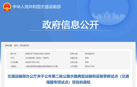 10月15日,交通运输部办公厅发布《关于第二批公路水路典型运输和设施零碳试点(交通强国专项试点)项目的通知》。
