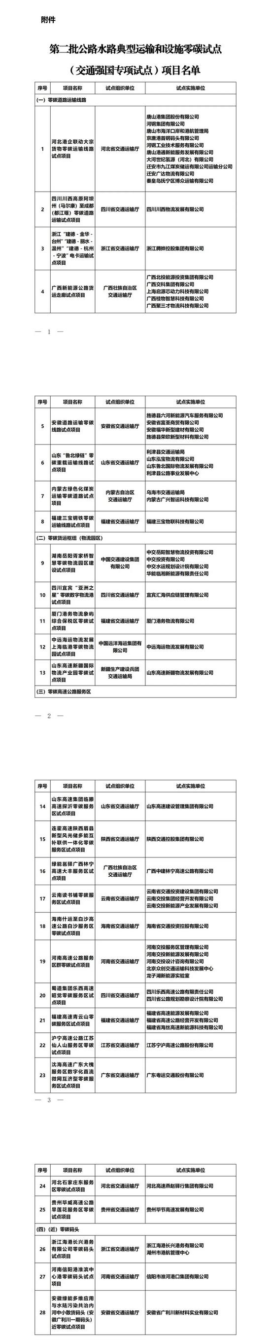 为深入贯彻党中央、国务院关于碳达峰碳中和重大战略决策部署,落实《交通强国建设纲要》《关于全面推进美丽中国建设的意见》《关于加快经济社会发展全面绿色转型的意见》有关要求,积极推动交通运输绿色低碳转型发展,有序推进零碳交通发展,经研究,现公布第二批公路水路典型运输和设施零碳试点(交通强国专项试点)项目(详见附件),有关事宜通知如下。
