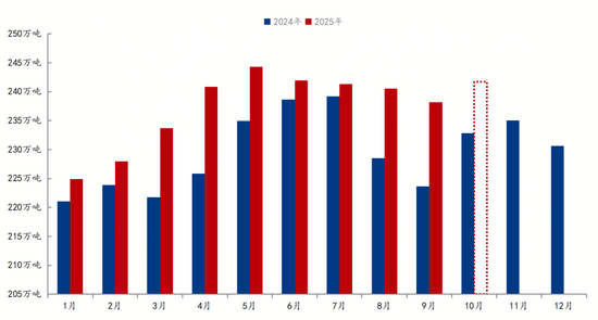 尽管当前钢厂盈利率约为56%,环比有所承压,但同比仍实现增长。在此背景下,钢厂仍可通过调配产品结构来维持整体盈利,这将维持钢厂的生产意愿。据市场反馈,部分企业拟将高炉年终检修计划推迟至明年初。与此同时,若西芒杜铁矿于11月顺利启动发运,将进一步支撑铁矿供应稳中趋增的格局,为铁水产量高位运行提供原料基础。根据Mysteel最新预测,10月份日均铁水产量预计在241-242万吨区间波动,仍处高位区间且短期内难以快速回落。
