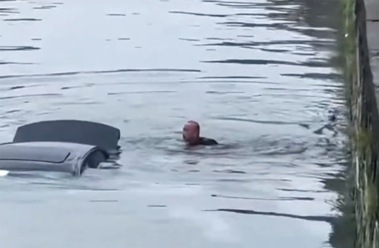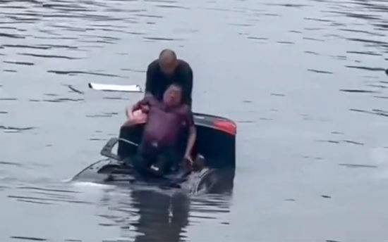 奋力游向正在下沉的车辆