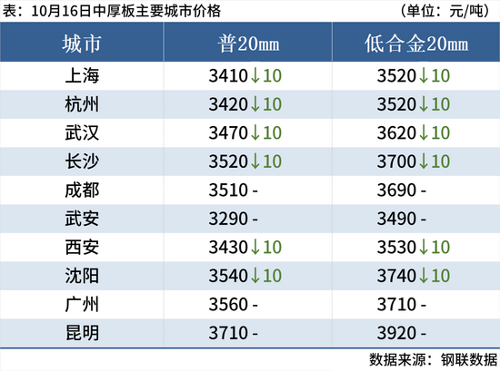 中厚板:10月16日,全国24个主要城市20mm普板均价3473元/吨,较上一交易日下跌7元/吨。市场交投氛围较为冷清,成交表现不佳,贸易商心态谨慎偏弱,纷纷降价出货。供应方面,中厚板钢厂生产稳定,市场资源有所增加,但接单情况一般,库存压力显现。需求端,国庆节后市场需求偏弱,全国消费量环比下降,下游采购积极性不高。综合来看,预计17日全国中厚板价格或继续偏弱运行。