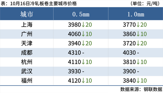 冷轧板卷:10月16日,全国24个主要城市1.0mm冷卷均价3921元/吨,较上一交易日下跌8元/吨。市场交投氛围谨慎,现货价格下挫打压市场信心,贸易商多低价让利出售,回笼资金为主。库存方面,Mysteel监测29个城市库存,本周冷轧板卷社会库存243.35万吨,周环比减少3.07万吨,月环比增加4.12万吨,目前库存变现能力依旧较弱。综合来看,预计17日冷轧价格或将窄幅偏弱运行。