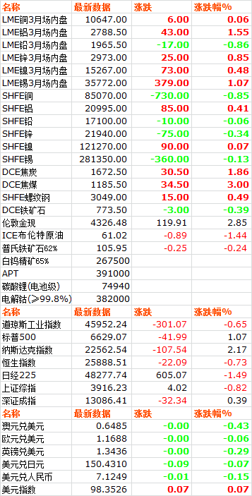 1016日,LME六种基本金属价格涨多跌少。三月期铜价收于10647美元吨,上涨0.06%。三月期铝价收于2788.5美元吨,上涨1.55%。三月期铅价收于1965.5美元吨,下跌0.86%。三月期锌价收于2973美元吨,上涨0.85%。三月期锡价收于35772美元吨,上涨1.07%。三月期镍价收于15267美元吨,上涨0.48%