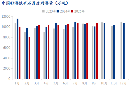 2025年7-9月中国47港铁矿石两港卸前到港量为32234万吨,同比634万吨,增幅0.38%。其中澳洲铁矿石累计到港20748万吨,同比增加146万吨,0.24%