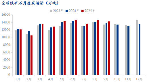 2025年7-9月全球铁矿石发运总量为42399万吨,同比增加1330万吨,3.2%。
