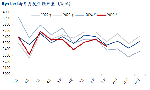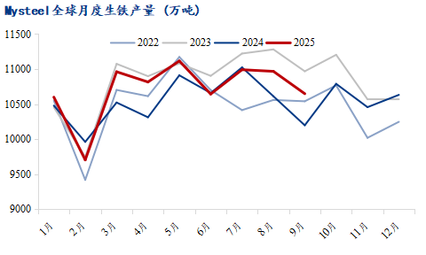 根据Mysteel统计,2025年7-9月份全球生铁产量为3.26亿吨,环比二季度增加32万吨,同比去年增加773万吨。