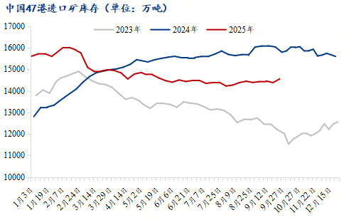 2025年7-9月中国47港港口库存表现为先库后库。截止26日,47港铁矿石库存总量14550万吨,比今年年初库存低1060万吨,比去年同期库存低1242万吨。