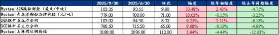 截止9月30日,62%澳粉指数为103.35美元/干吨,较年初涨幅2.43%;2025年7-9月,黑色市场以反内卷政策为主线,叠加美联储降息落地、铁矿石供应扰动消息,62%澳粉指数最高反弹到107美元/干吨,铁矿石价格高位震荡,三季度62%澳粉指数均价102美元/干吨,环比上涨5美元/干吨,同比上涨2美元/干吨。