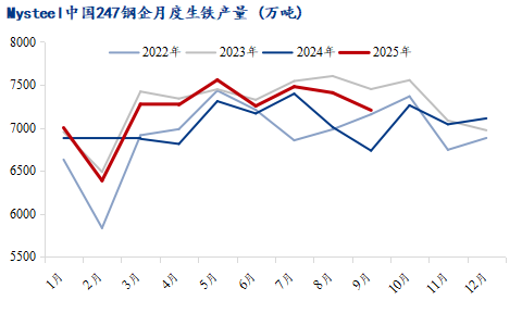 根据Mysteel247家钢企高炉铁水数据显示,2025年7-9月份中国样本高炉生铁产量为2.2亿吨,环比增加13万吨,同比增加951万吨,增幅为4.5%。日均铁水产量达到了240.25万吨/天,同比去年增加10.62万吨/天,增幅为4.6%。