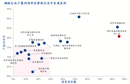 钢铁行业当前产能利用率保持在75%以上,且处于2016年以来85%的较高历史分位数水平,这表明在经历2016年供给侧改革及近年的粗钢产量调控政策后,钢铁行业的产能压力已得到有效控制。
