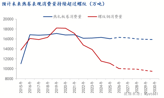根据Mysteel调研的小样本数据显示来看,从2022年开始,热卷的表观消费量已经超过螺纹,并且螺纹钢的需求近几年均处于下行趋势,背后是房地产投资的明显走弱以及制造业的技术革新带来的用钢需求变化。综合房地产的新开工需求还会持续减弱,而制造业在高质量发展的背景,未来对热卷的需求仍有上升空间。因此钢厂生产“螺转卷”趋势将在未来五年持续。