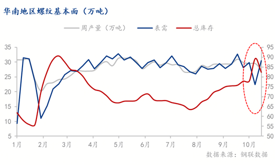 10月16日广东地区也出现挺价行为,主要是广东地区需求偏弱,价格较低,出现亏损。目前“金九银十”的华南地区10月总库均值83万吨,9月总库76万吨,逐渐累库,其中10钢厂库存均值30万吨,环比增长4万吨。(广东中南钢铁股份有限公司、阳春新钢铁、珠海粤裕丰钢铁有限公司等发布具体内容:近期原材料成本大幅上涨,但成材价格持续走低,省内各钢厂已进入严重亏损状态。鉴于此,针对销售价格低于3000元/吨而造成的损失,我司概不负责。对于拒不执行指导价的行为,我司将进行严厉警告和考核,并暂停资源发货。)