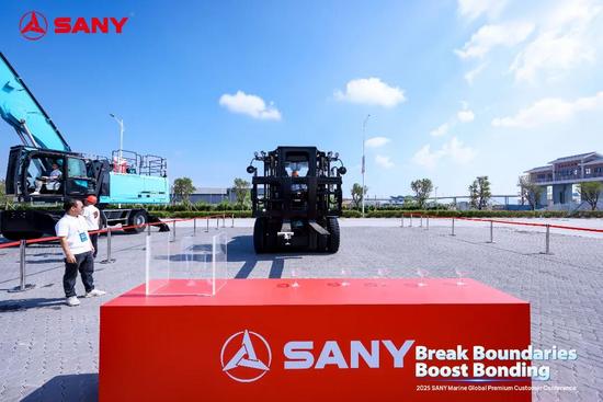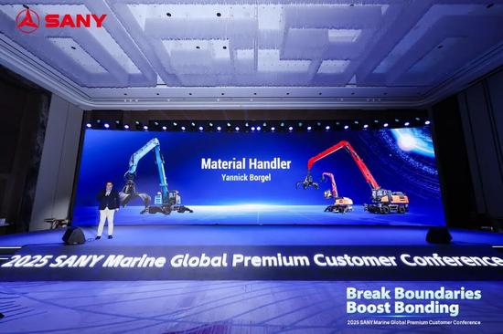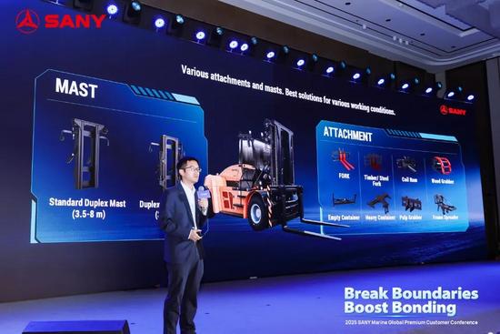 三一海工产品研发负责人向全球客户和代理商重点介绍了物流装备的先进技术与创新成果:新款纯电抓料机实现了小时续航与20%效率提升的双重突破电动叉车1度电等同于2-2.5L柴油,能耗成本显著降低