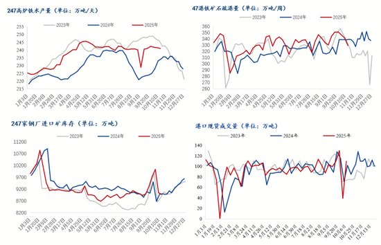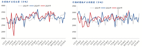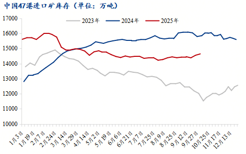 47港铁矿石到港量环比增加,处于近三年同期高位水平。根据Mysteel47港铁矿石到港量数据显示,本期值为3144.1万吨,周环比增加368万吨;10月到港量周均值为2959.95万吨,环比上月增加380万吨,同比去年增加420万吨。今年以来,47港铁矿石到港量累计同比减少965万吨,其中澳洲累计同比减少74万吨,巴西累计同比增加293万吨,非主流累计同比减少1185万吨。根据模型测算及近期天气预测,预计下期到港量回落。